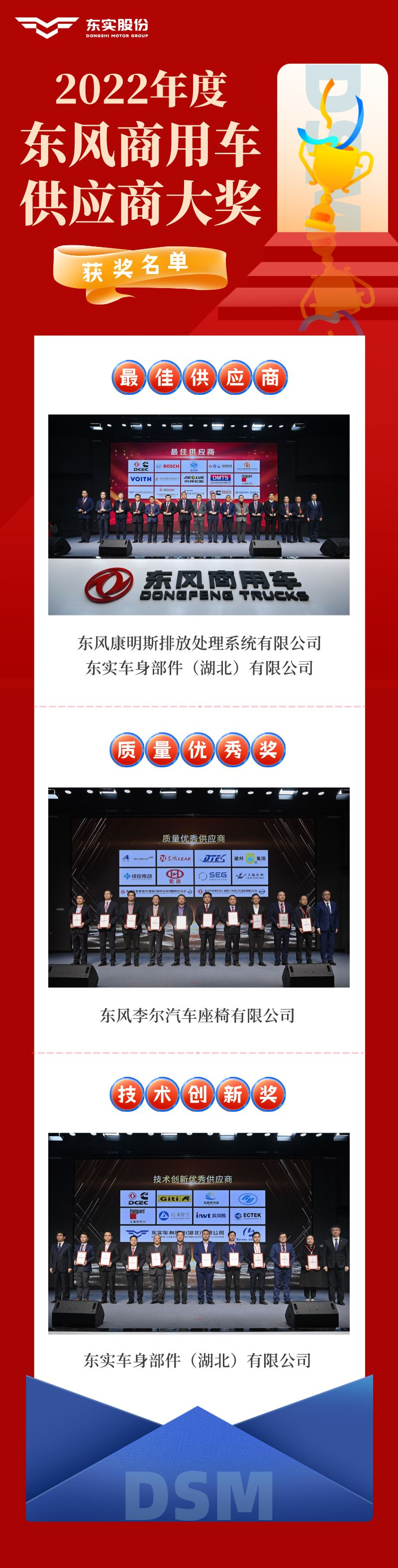 近日,東風(fēng)商用車有限公司、神龍汽車有限公司、東風(fēng)柳州汽車有限公司、東風(fēng)乘用車公司、東風(fēng)康明斯發(fā)動機(jī)有限公司相繼召開2023年供應(yīng)商大會,對過去一年來緊密配合協(xié)同、作出重要貢獻(xiàn)的供應(yīng)商伙伴進(jìn)行表彰,東實股份下屬企業(yè)連獲多項供應(yīng)商大獎。